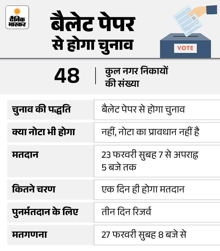 इस बार मतदान बैलेट पेपर से होगा और नोटा का प्रावधान नहीं रखा गया है। राज्य चुनाव आयोग के सचिव राधेश्याम प्रसाद ने बताया कि सभी जिलों को आवश्यक दिशा-निर्देश जारी कर दिए गए हैं। निकाय क्षेत्र के हर बूथ पर सशस्त्र पुलिस बल की तैनाती की गई है।